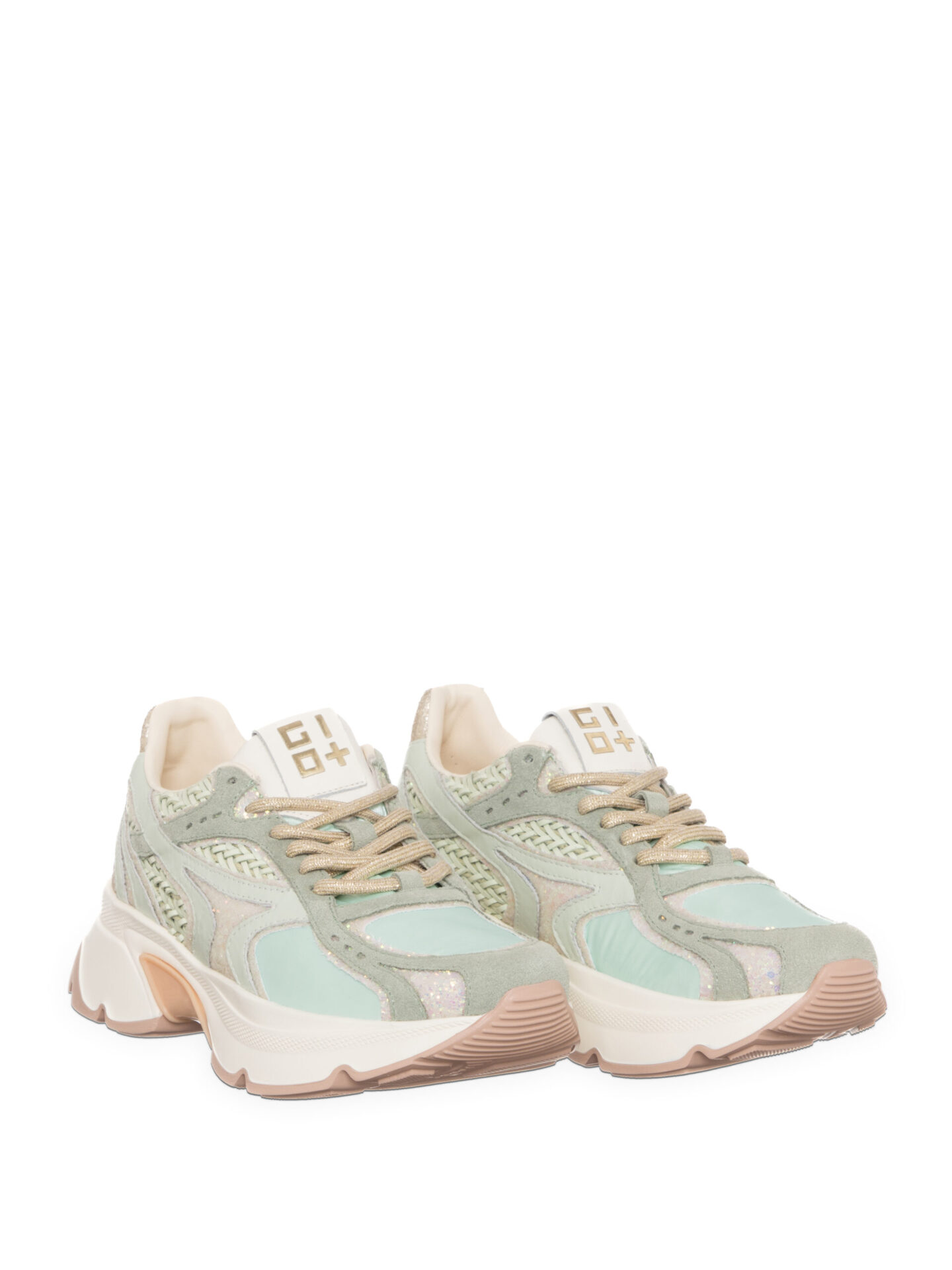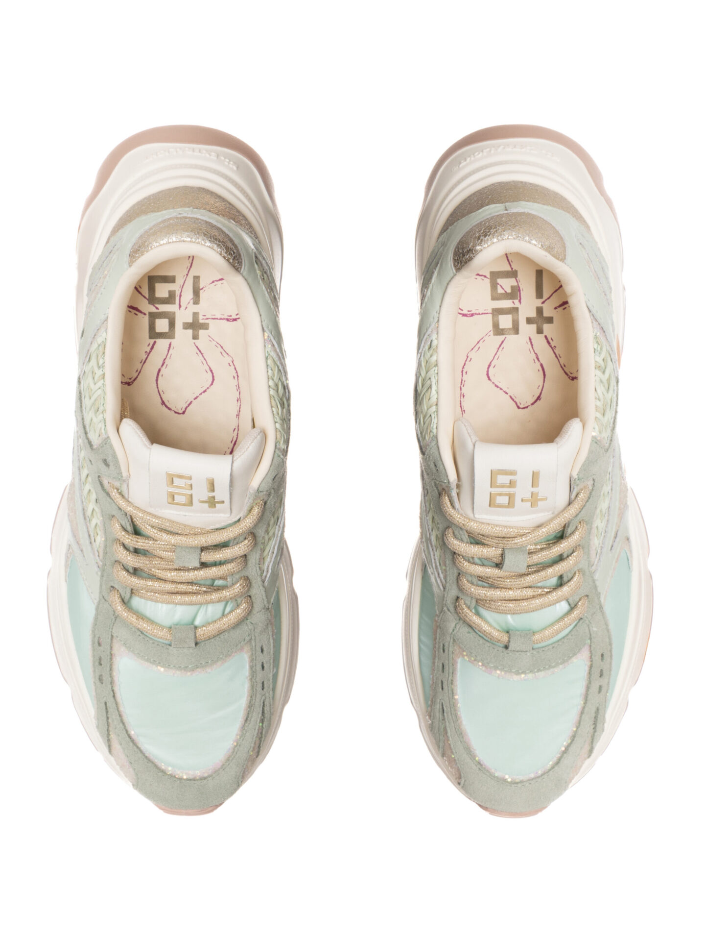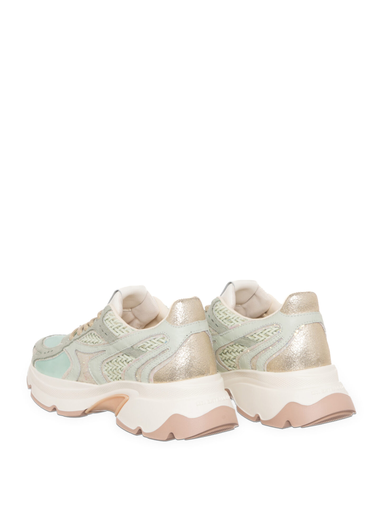 Zgornji del je izdelan iz kakovostnega akvamarin usnja, dopolnjen z zelenim tekstilom in elegantnim platinastim vložkom, ki doda subtilen lesk. Poseben poudarek dajejo platinasti bleščeči detajli in platinaste vezalke, ki ustvarjajo sodoben, luksuzen videz.
