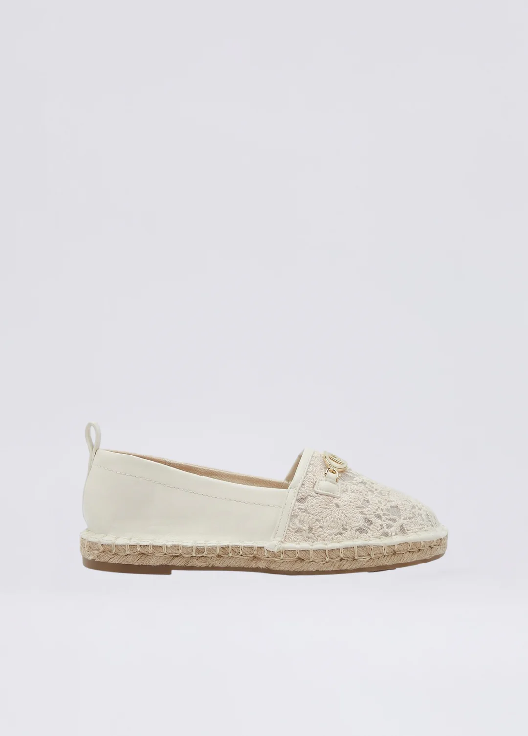 Elegantne espadrile v bež barvi, spredaj makrame vzorec in zlat detajl.