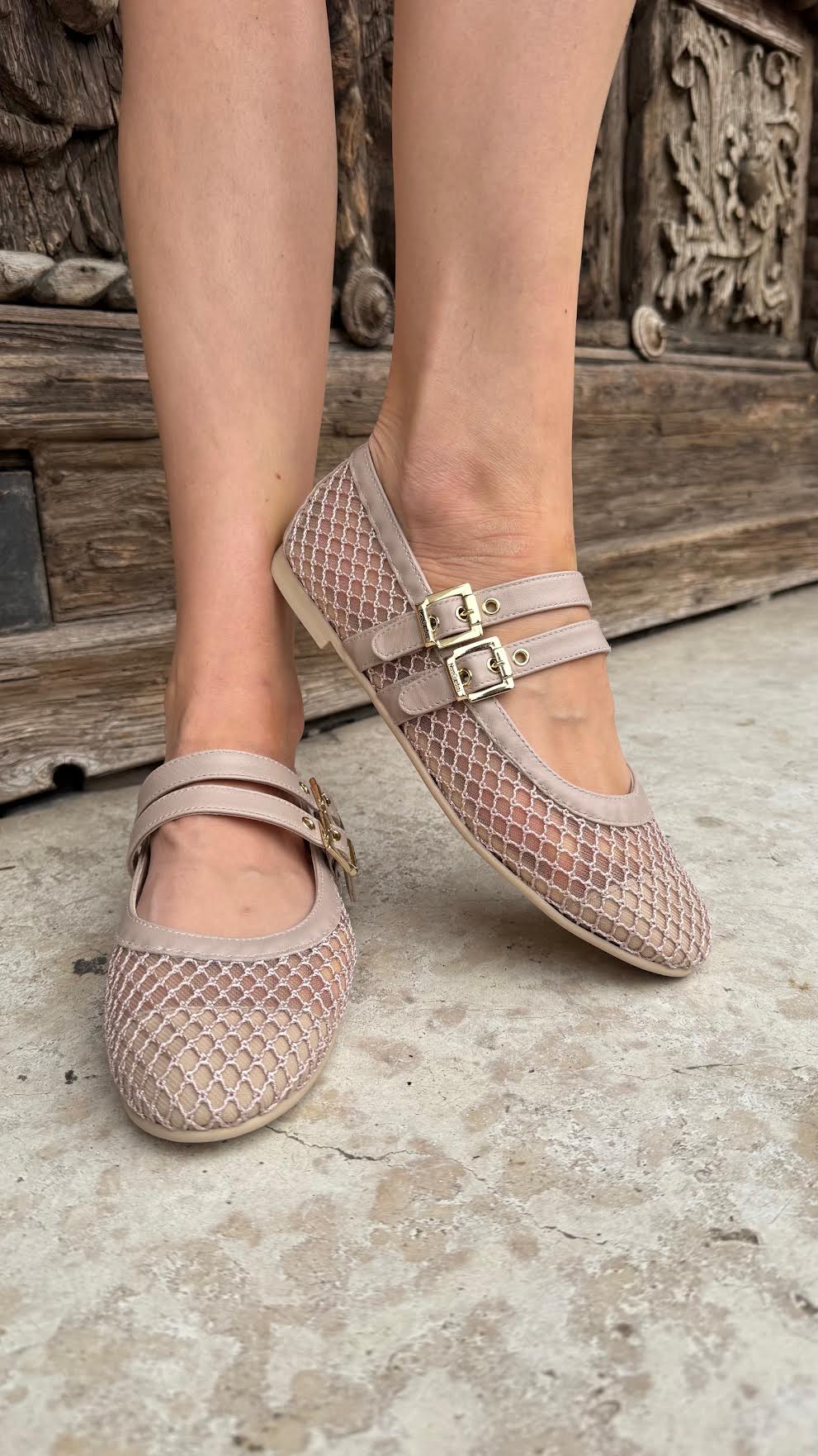 Ženske balerinke NeroGiardini iz fine mrežaste tkanine v elegantnem bež odtenku. Dvojni paščki z nastavljivo kovinsko zaponko zagotavljajo stabilnost in udobno prileganje. Zračen, lahek material daje čevlju prefinjen in sodoben videz, raven podplat pa omogoča udobno nošenje skozi ves dan. Popolna izbira za elegantne in vsakodnevne poletne kombinacije.