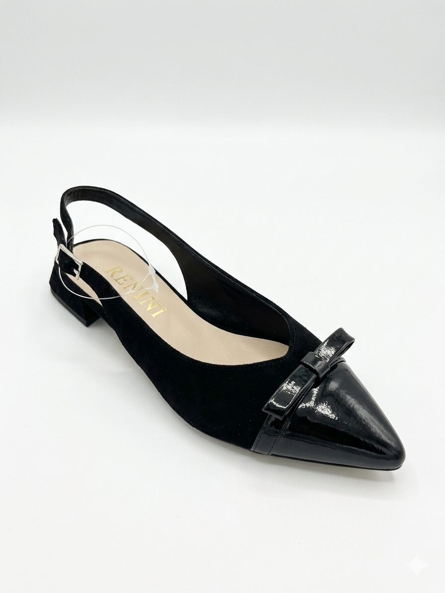 Renini črne balerinke iz usnja, spredaj na špico (lakast videz) ; spredaj zaponka. Balerinke imajo nizek podplat črne barve. Zapiranje ob strani z zaponko.