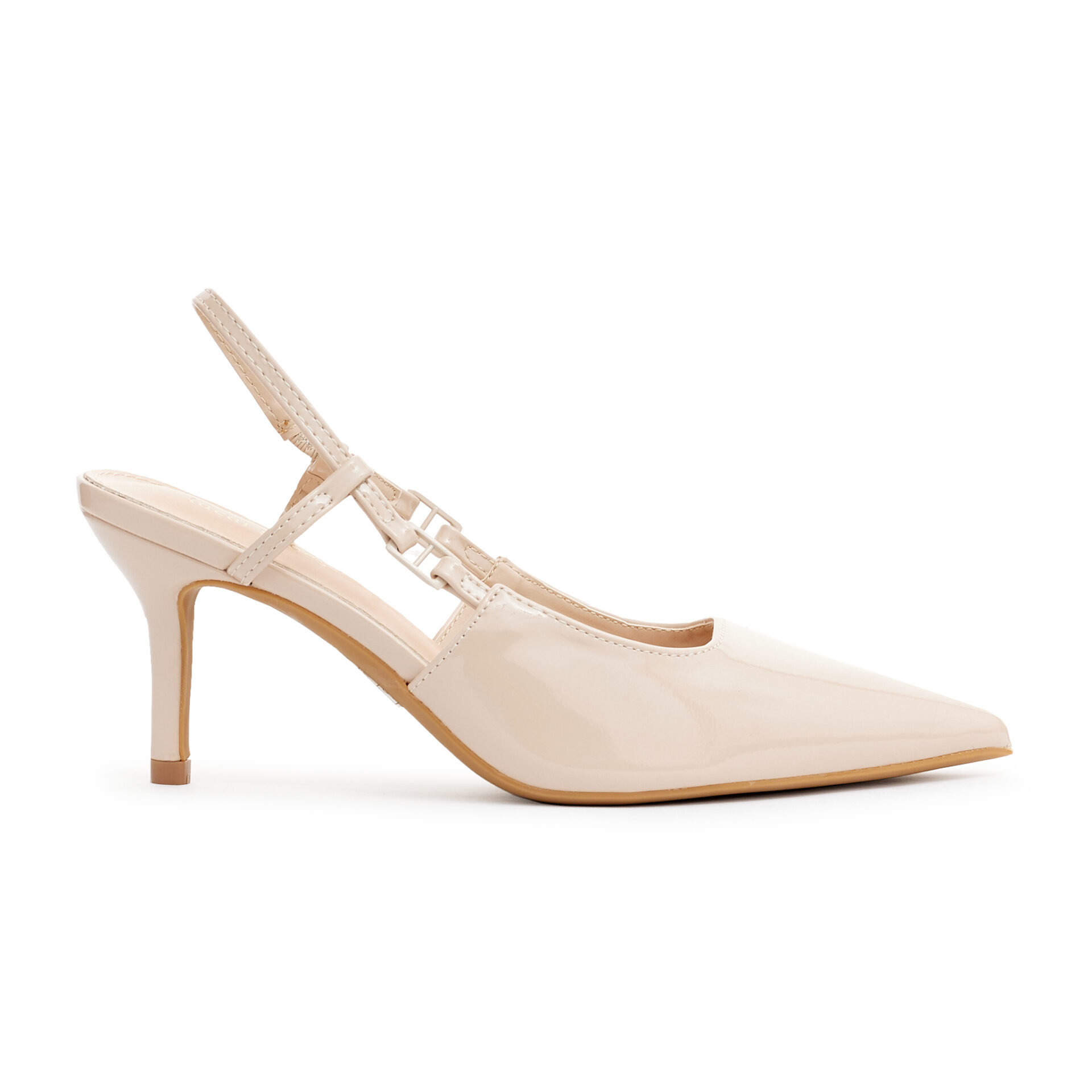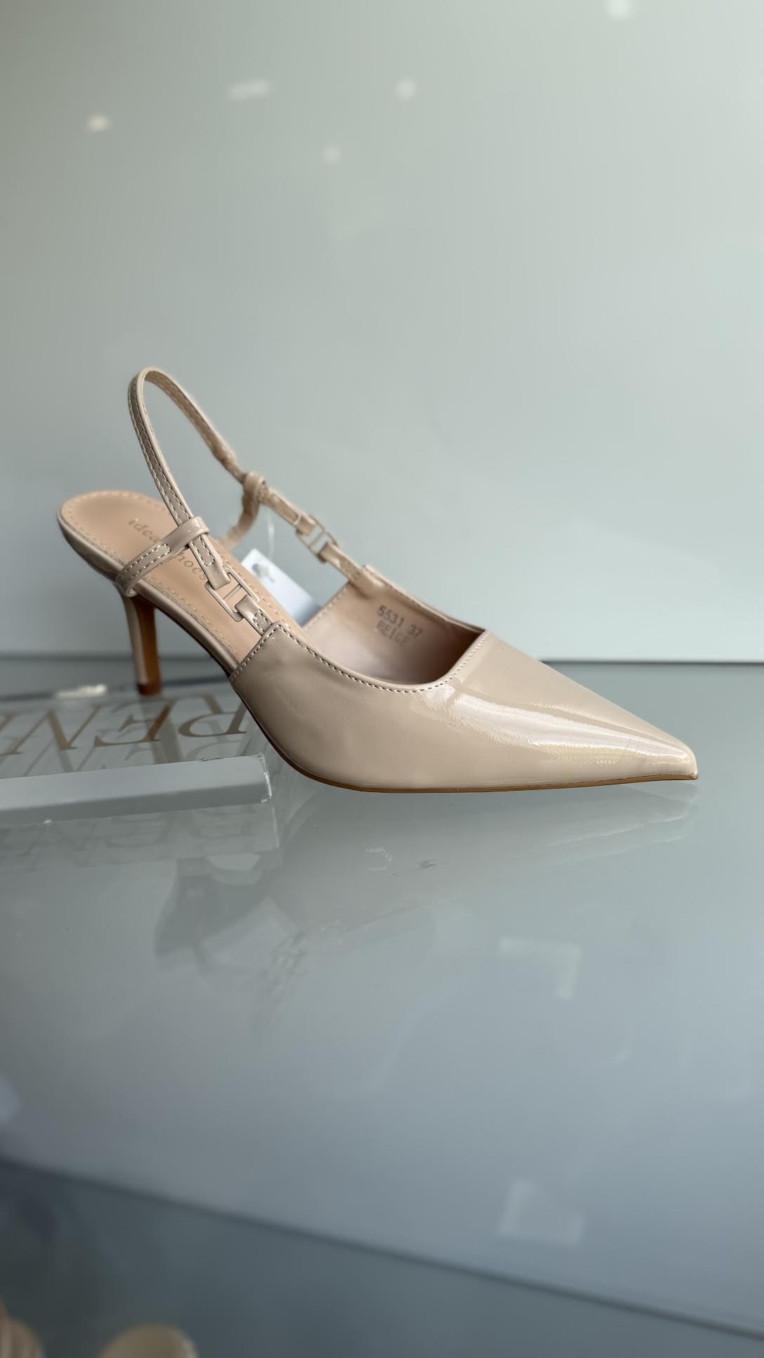 Petke v lakastem videzu, v bež barvi, spredaj na špico, zadaj odprti. Višina pete (9 cm).